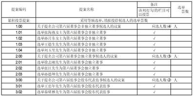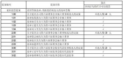 ③选举推进代表监事2名(如提案3,有2位候选东说念主)推进所领有的选举票数=推进所代表的有表决权的股份总额×2 推进不错将票数对等分拨给2位监事候选东说念主,也不错在2位监事候选东说念主中即兴分拨,但总额不得迥殊其领有的选举票数。
